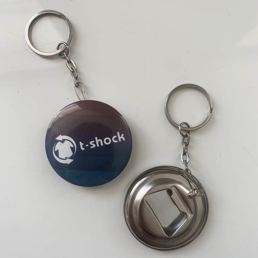 Přívěšek - placka s otvírákem na lahve. Plnobarevný tisk (logo, text, abstrakce), přední strana je překrytá lesklou průsvitnou ochrannou fólií. Cena je uvedena za jeden kus. Přívěšek s otvírákem má široké možnosti využití, např. pro propagaci kapely nebo firmy, k maturitě, nebo na letní tábor.